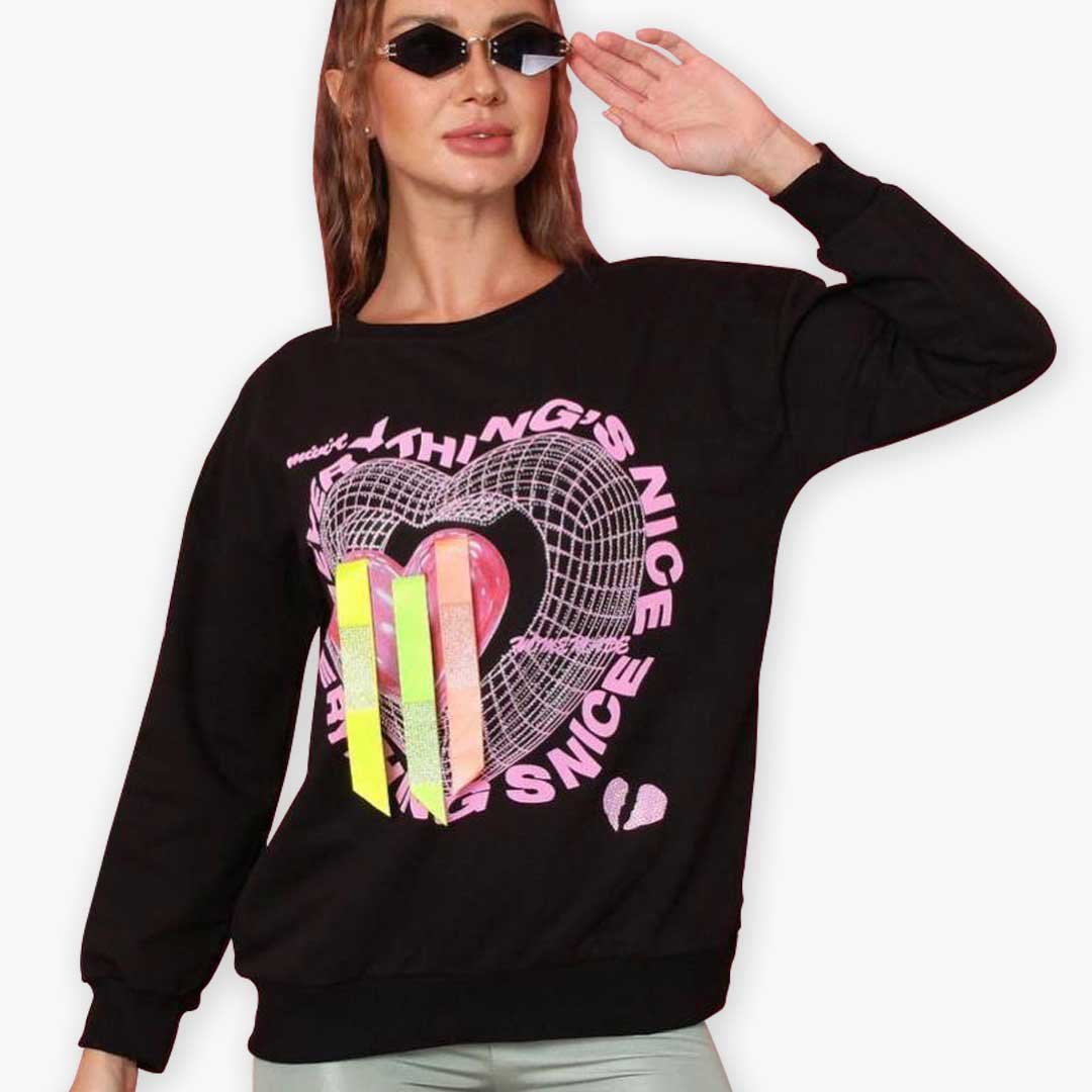 Whether you’re pairing it with jeans for a casual day out or with leggings for a relaxed look at home, this sweatshirt adapts to your style effortlessly. The black base color makes it easy to mix and match with various outfits, while the vibrant design adds a touch of personality.