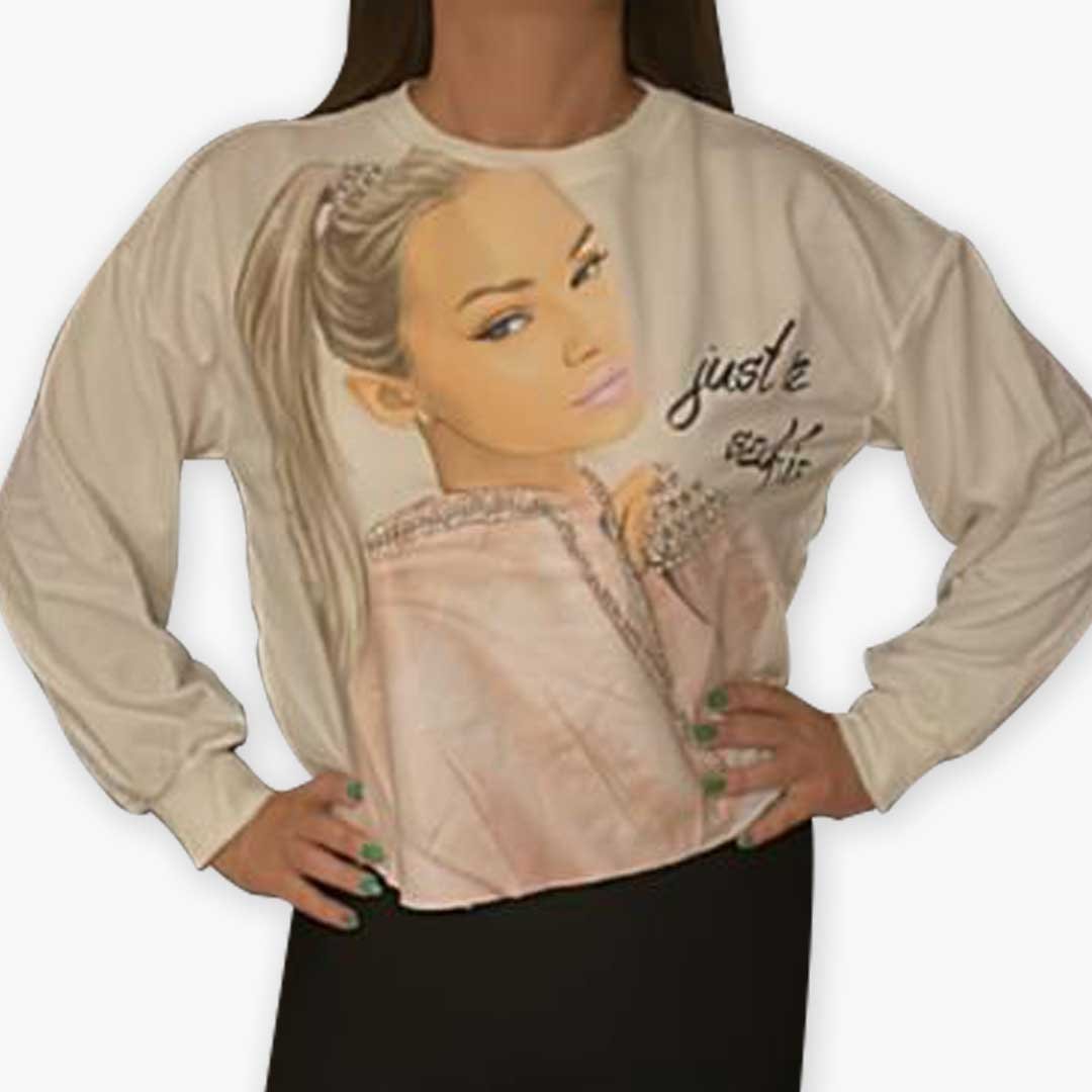The sweatshirt features a captivating graphic that reads “Just Selfie,” making it a perfect choice for selfie enthusiasts. The design is printed using high-quality ink that ensures longevity and vibrancy.