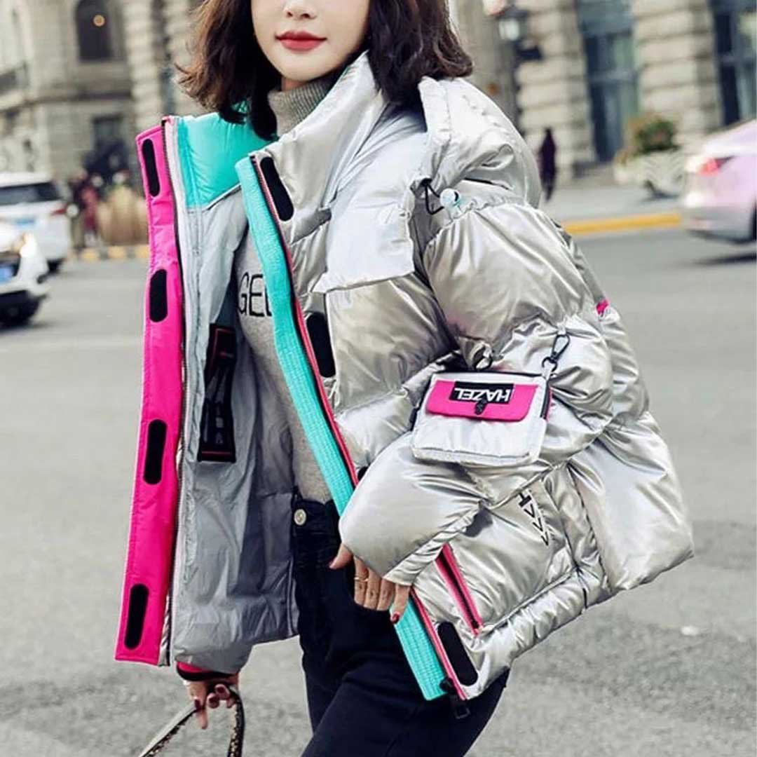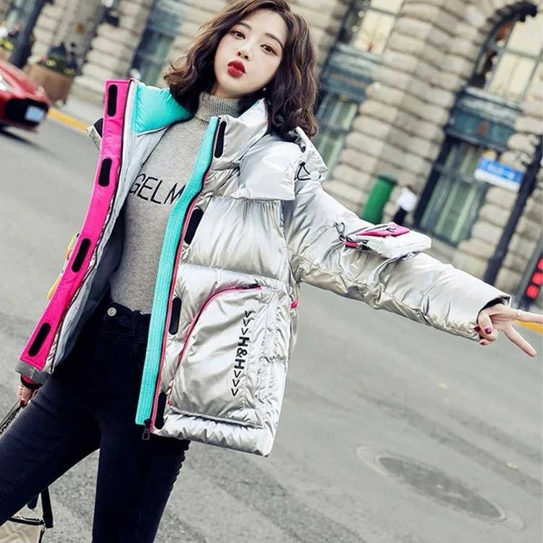 Elevate your winter wardrobe with our Women’s Silver Metallic Down Puffer Jacket. This stylish jacket features parka pockets in a trendy pinkish-greenish hue, adding a touch of flair to the metallic silver exterior. Complete with a hooded hat, the zipper allows for easy removal, providing versatility in your winter fashion.
