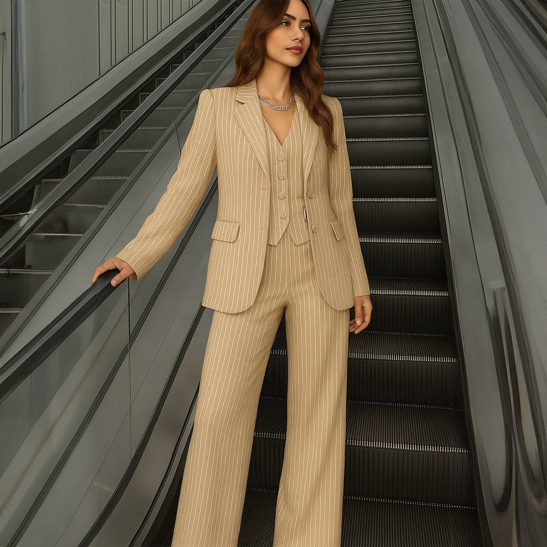 The Vest Stripe 3-piece women’s suit is your ultimate wardrobe solution, designed to deliver polished professionalism with effortless versatility. Look impeccable from morning meetings to evening events without ever changing your outfit.